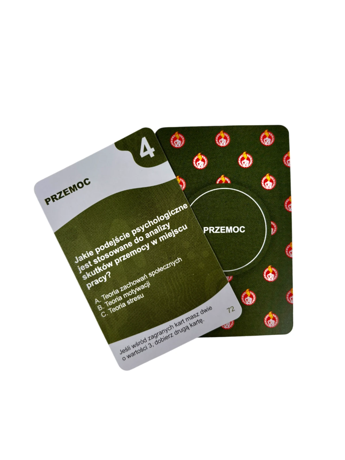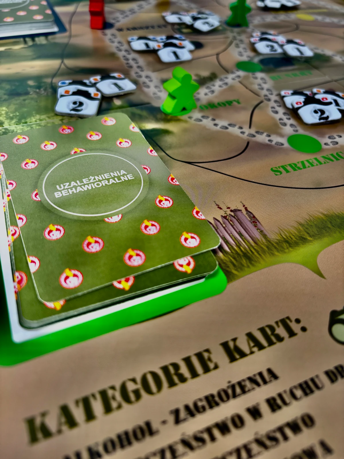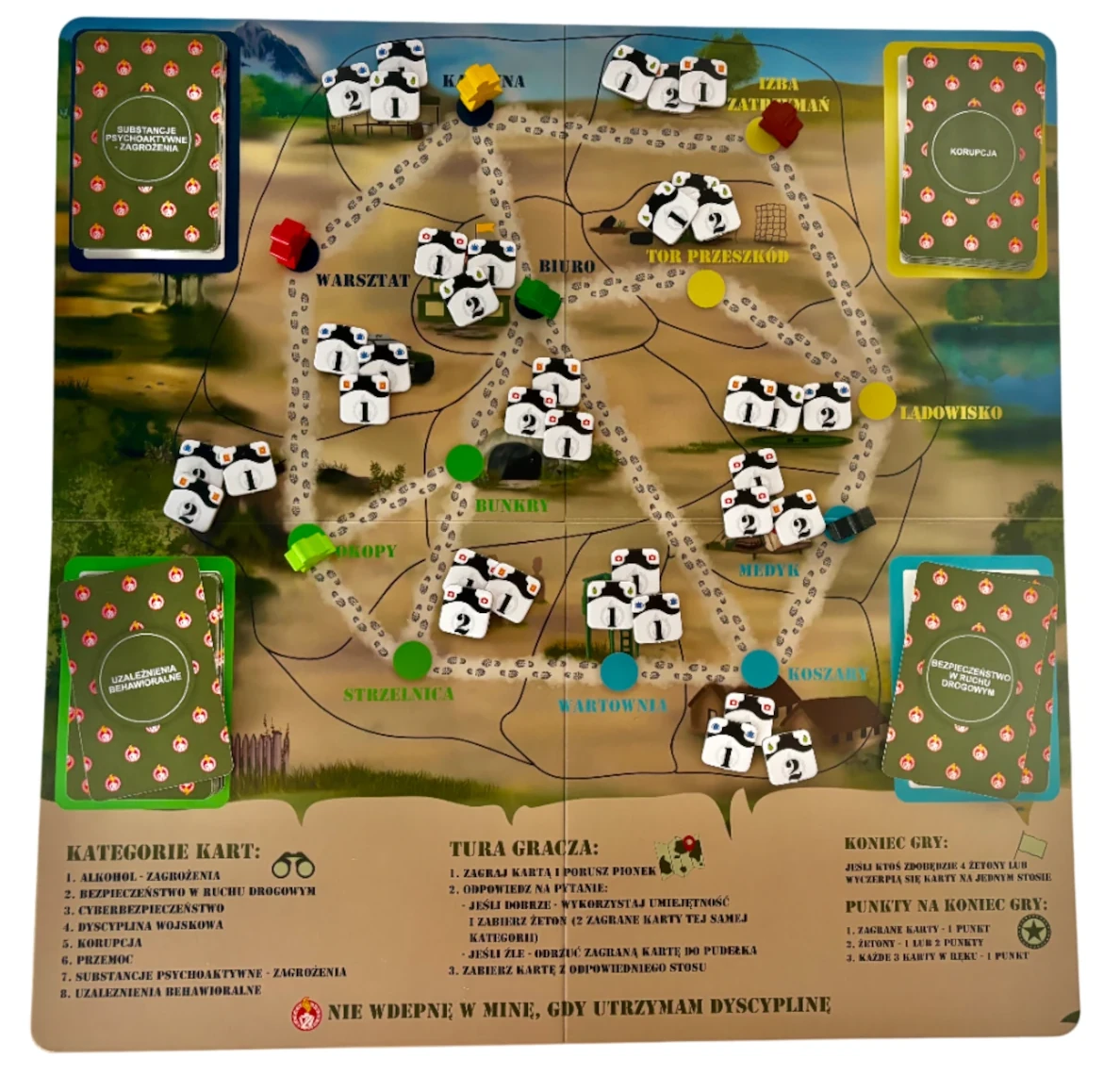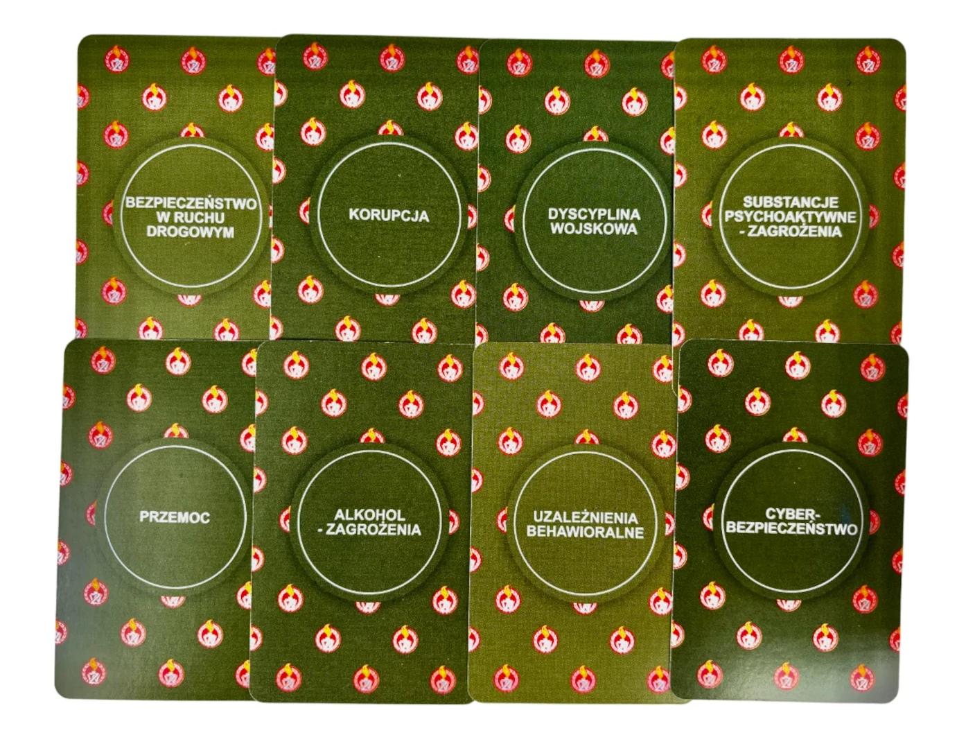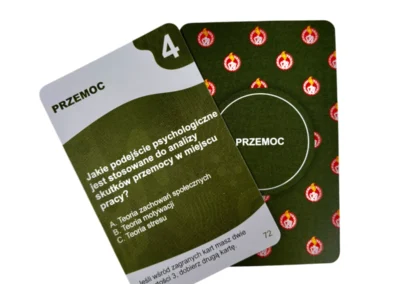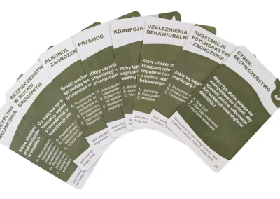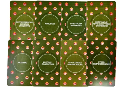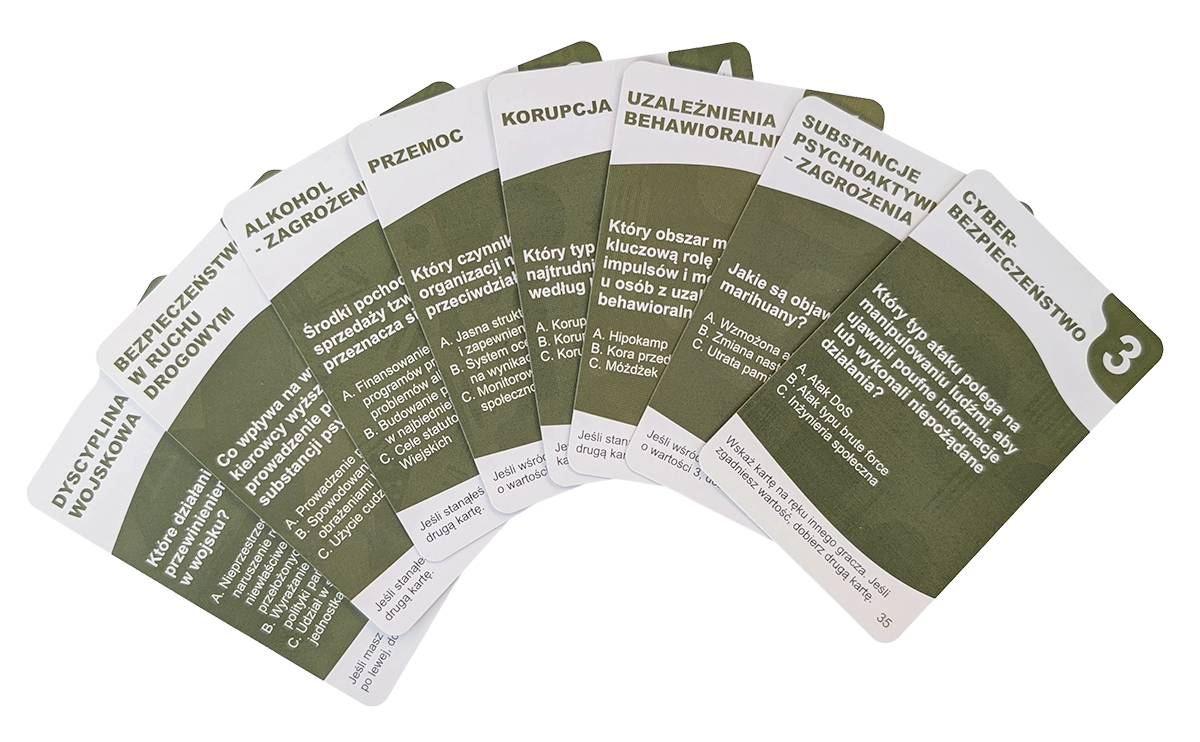 130 kart to serce edukacyjne gry. Każda karta zawiera starannie opracowane pytanie z jednej z ośmiu kategorii profilaktycznych: zagrożeń związanych z alkoholem i narkotykami, uzależnień behawioralnych, cyberbezpieczeństwa, bezpieczeństwa w ruchu drogowym, korupcji w środowisku wojskowym, dyscypliny wojskowej, przemocy oraz mobbingu.