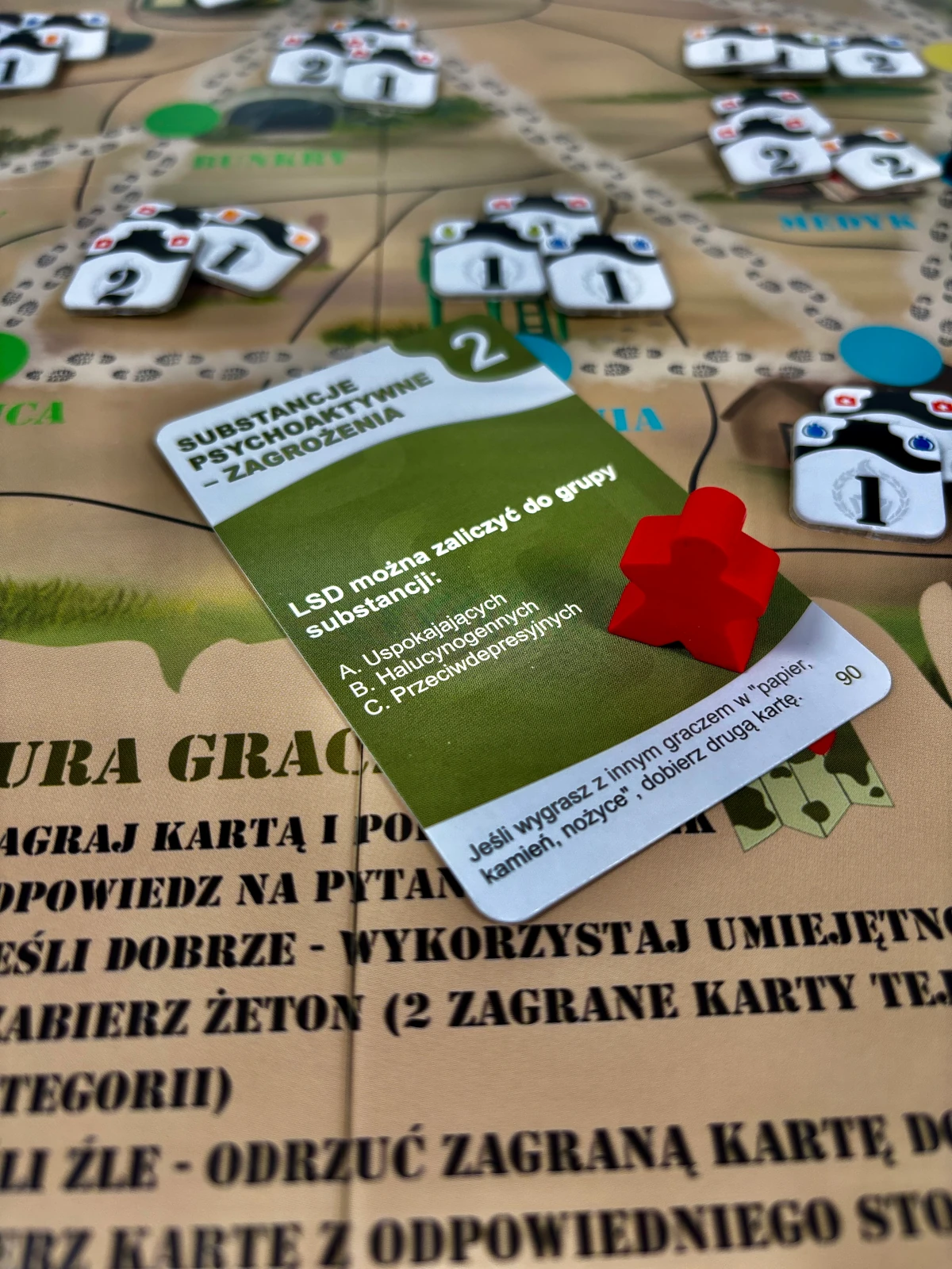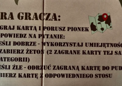 Karty w grze pełnią podwójną rolę: są elementem rozgrywki (decydujesz, którą zagrać, by wykonać optymalny ruch) i narzędziem edukacyjnym (uczysz się, odpowiadając na pytania). To połączenie sprawia, że wiedza przestaje być nudnym obowiązkiem, a staje się kluczem do zwycięstwa w grze.