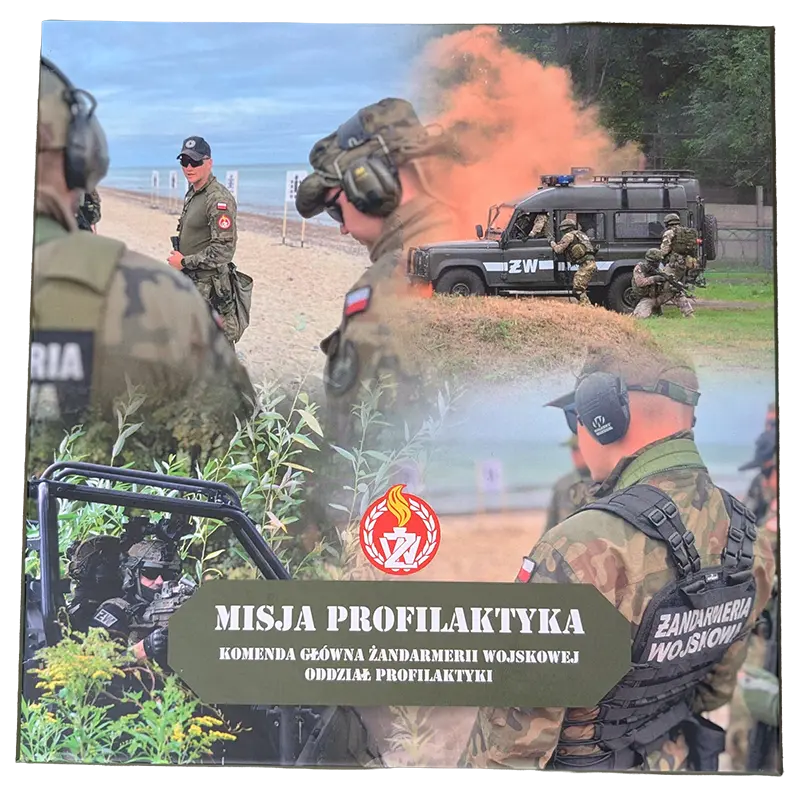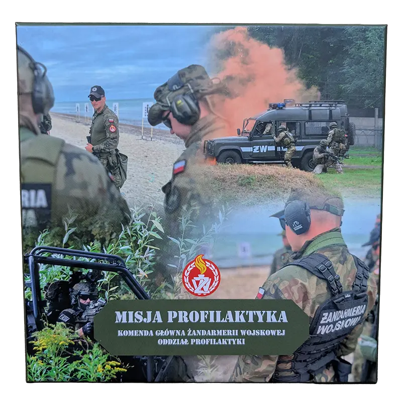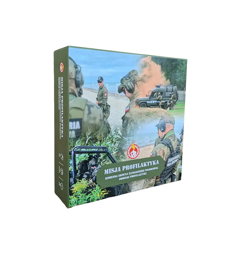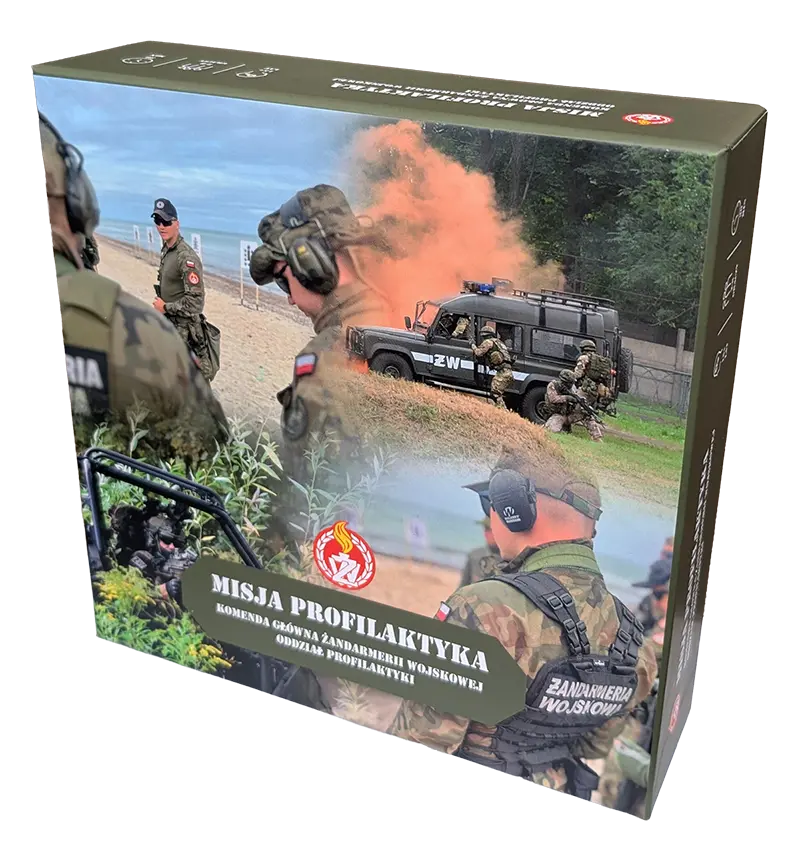Pudełko wyróżnia się profesjonalnymi zdjęciami przedstawiającymi żołnierzy Żandarmerii Wojskowej w trakcie rzeczywistych akcji ćwiczebnych.