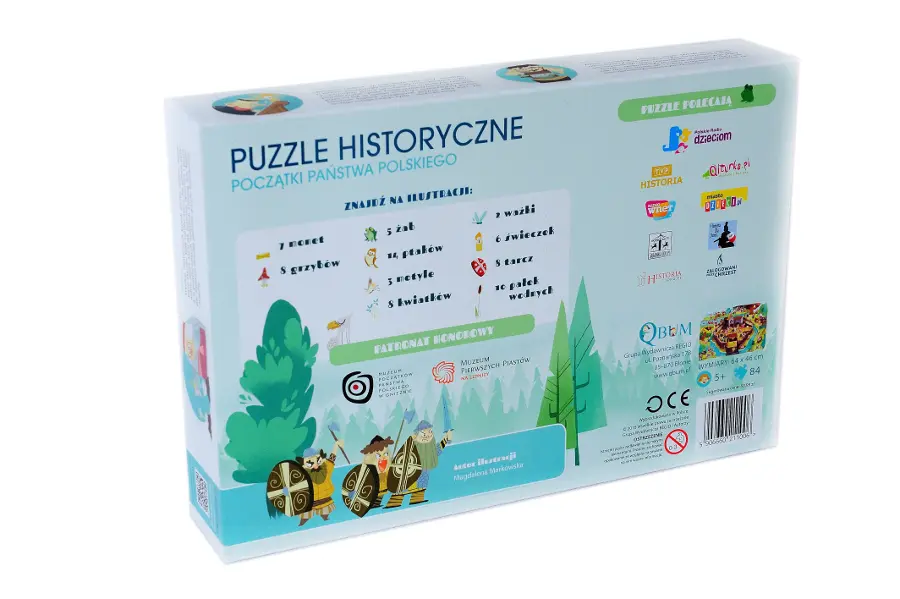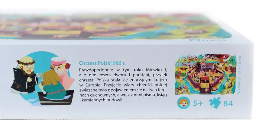 84 nieregularne fragmenty, tworzą po złożeniu kolorowy, zabawny obrazek grodu obwarowanego drewnianą palisadą. Znajdziesz w nim historyczne postacie w historycznych momentach – Mieszko I ślubuje Dobrawie, wojowie walczą pod Cedynią z armią margrabiego Hodona. Są tu także postacie z legend i podań – pod rozłożystym dębem orła wypatrują Lech, Czech i Rus, a nieszczęsny Popiel próbuje uciec zgrai szarych myszy.